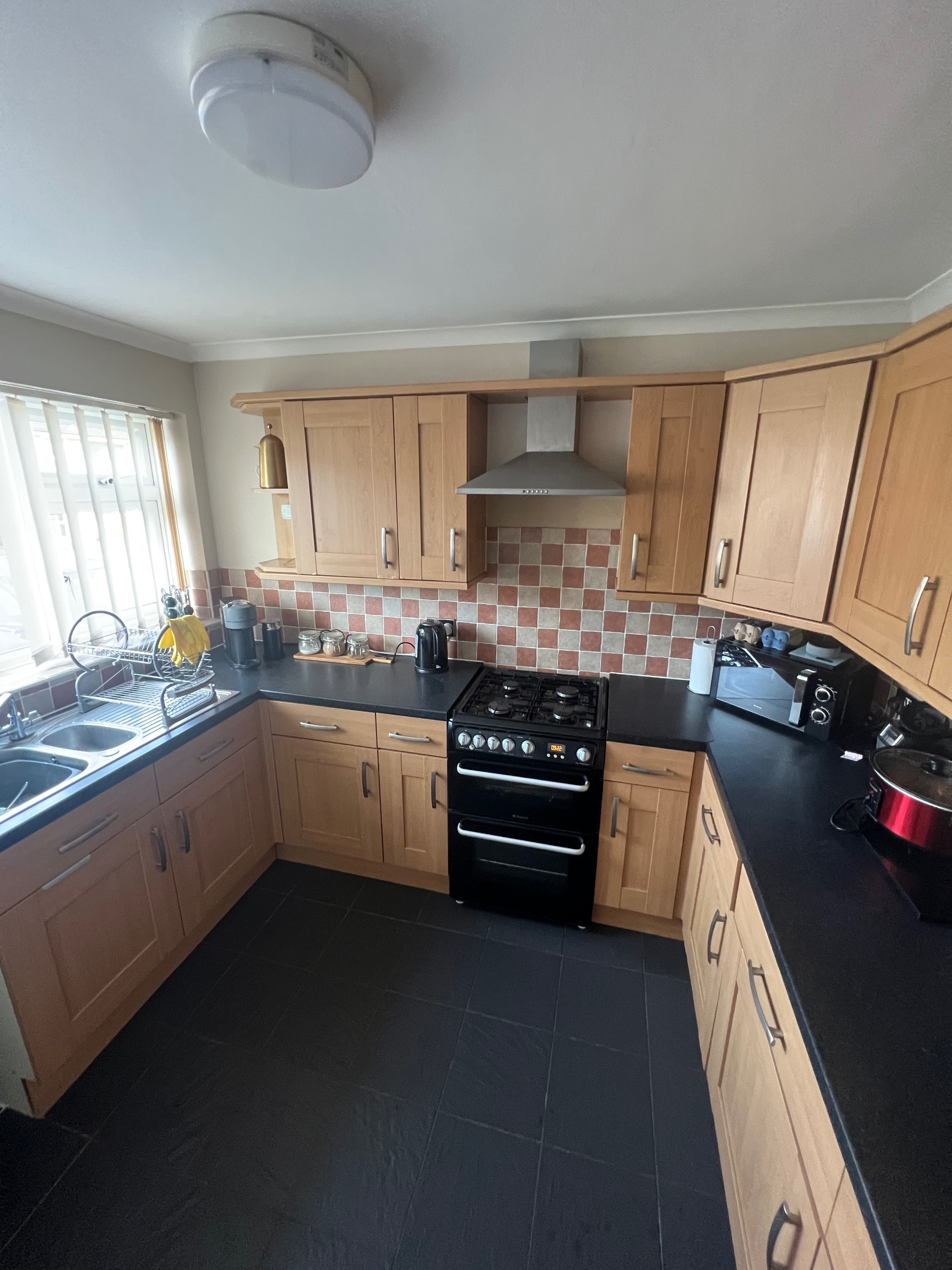 Welcoming porch entry leading into a modern kitchen (cooker & fridge included)